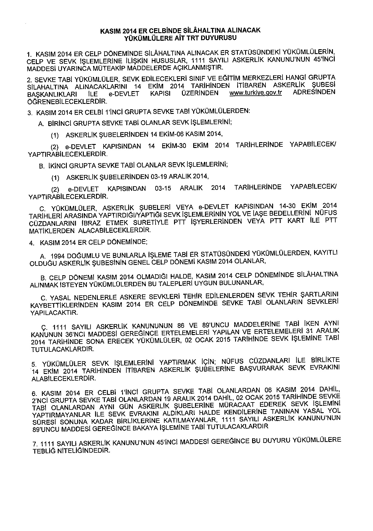 KASIM 2014 ER CELBİNDE SİLAH ALTINA ALINACAK YÜKÜMLÜLERE AİT TRT DUYURUSU